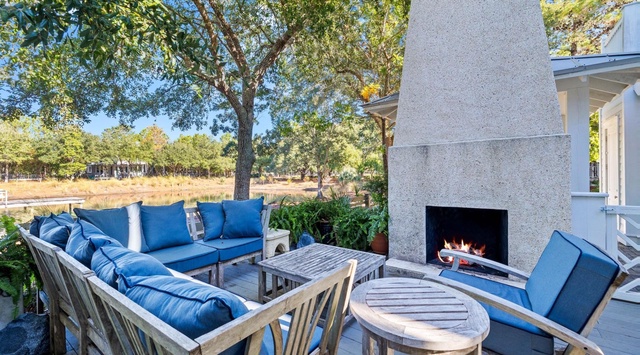 An airy front porch with rocking chairs and fans sets the mood for a peaceful vacation as guests arrive at the 3-level Main House. Head inside to an enormous great room filled with natural light, hardwood floors, and a mix of coastal colors. The sitting area offers 2 soft couches and 2 armchairs and effortlessly melds into the gourmet kitchen, equipped with top-of-the-line appliances—including a wine cooler and Wolf stove. A wall-mounted 75” Smart TV is viewable throughout the space for entertainment. Guests can enjoy meals at the round table for 4, the 10-person dining table, or the 5-stool breakfast bar. Outdoor dining is also available on the patio table for 6. On the wraparound back porch, savor lake views while grilling or sinking back on cushioned furniture around the outdoor fireplace. An outdoor shower and laundry room provide convenience after visiting the beach. At the end of the day, guests can retire to the lavish primary bedroom with a king bed and TV.