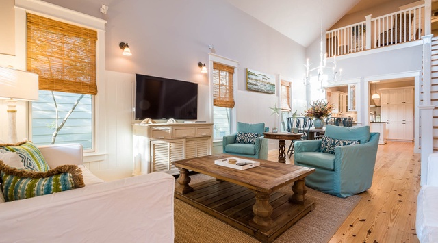 DETAILS: You are sure to smile as soon as you enter this beautiful cottage decorated in a coastal style, located near the beach and pool! A wonderful open deck welcomes you with plenty of seating and a built in grill. Enter into a cozy beach-style living area, which features beautiful hardwood floors throughout, a living room with ample seating and a television with DVD and stereo. The comfortable dining area is adjacent to the bright and airy kitchen and provides stainless steel appliances, granite countertops and also a center island counter. There is a convenient office area that offers a desk with a high-speed Internet connection. The primary suite and a second bedroom are also located on the first floor. The private primary bedroom features large windows, a king bed, TV, and a connecting bath with a double vanity and a separate shower and tub. The second bedroom features a king sized bed, a TV, and a connecting bath with a 2 separate vanities with a shower/tub combo. On the second floor, you will find two additional bedrooms and a cozy sitting area. The first bedroom features a queen bed and a television. Leading into the second bedroom is a set of twin bunks and a chalk board wall where the kids will love to make masterpieces. When entering the second bedroom, you will find a twin bed with trundle and TV. There is a separate bath with a single vanity and a shower/tub combo. The comfortable sitting area features a daybed style couch and additional chairs where you can relax with a good book. This terrific home also offers an outdoor shower and a carport.