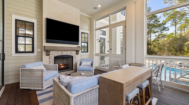 Worries slip away between the shiplap walls of this 2-story home. Step inside to find coffered ceilings and gleaming wood floors in the first-floor great room. With plenty of space for family and friends, guests will love spending time lounging on the comfortable sofas and armchairs in the living area as the fireplace warms cool nights and the conversation flows. Gather in the kitchen, where Wolf appliances make cooking a euphoric experience, and share a chilled bottle from the wine cooler as the group chef works culinary magic. The 6-person dining table is nestled inside a windowed alcove. Through the sliding glass doors is the airy lanai, seamlessly merging indoor and outdoor living with a built-in grill, soft seating, TV, and 2-person café table—the ultimate spot to while away a blissful day. Steps out the back door, discover the crystalline pool with 4 nearby loungers and a remote setting that abuts the thriving greenspace behind the home. Retire to the guest bedroom with a king bed and private bathroom.