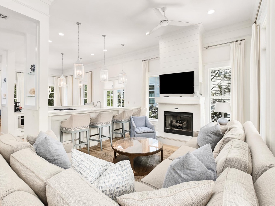 The second floor is the heart and soul of this WaterColor retreat. Here you’ll find a gourmet kitchen with designer cabinets and select stainless appliances, including a Thermador freezer and a Jenn Air gas burner range. The counter has seating for 4, while the adjacent dining area offers seating for 10. The living room has a vast sectional sofa, a 50-inch flat-screen television. It accesses a vast porch with sweeping neighborhood views. The high ceilings, hardwood floors and abundant natural light complement the entire space.