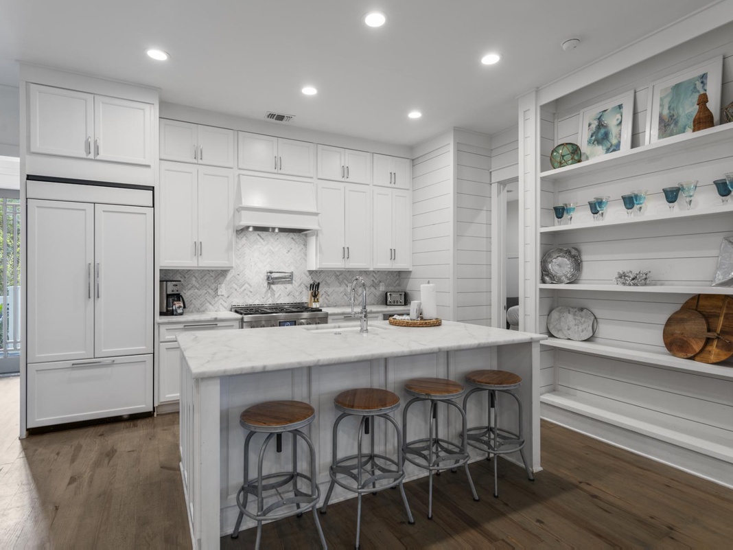 DETAILS: You will enter this Camp District home through a charming screen porch outfitted with a swinging bed and an awesome outdoor dining table, perfect for dinner al fresco! Enter into an open living space wrapped in fresh shiplap and lightly stained hardwood floors. This floor plan connects the living room, dining room and kitchen. With all stainless steel appliances, huge pantry, marble counter tops and ornate tile work, this kitchen is fit for a master chef. The first floor includes one stunning guest bedroom. The first bedroom gives you a sneak peak of the unbelievable design work put into this home. It includes a king bed and an ensuite that will easily be mistaken for the primary! There is also a half bathroom located on this floor.
