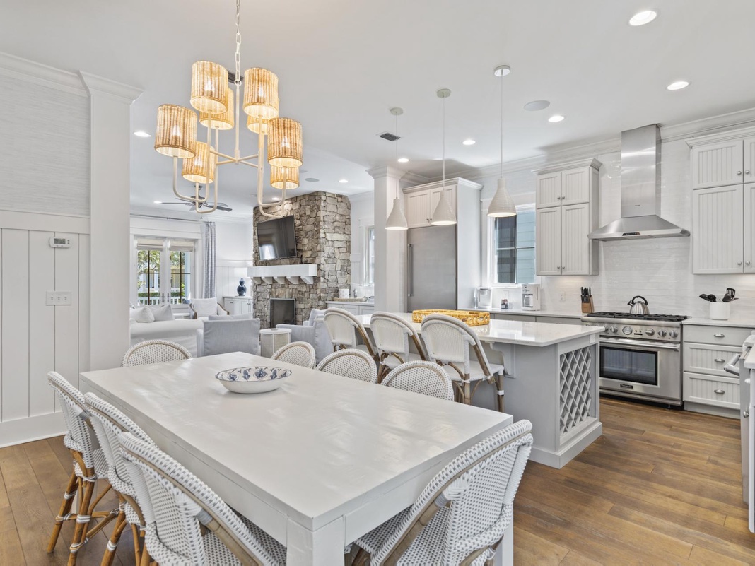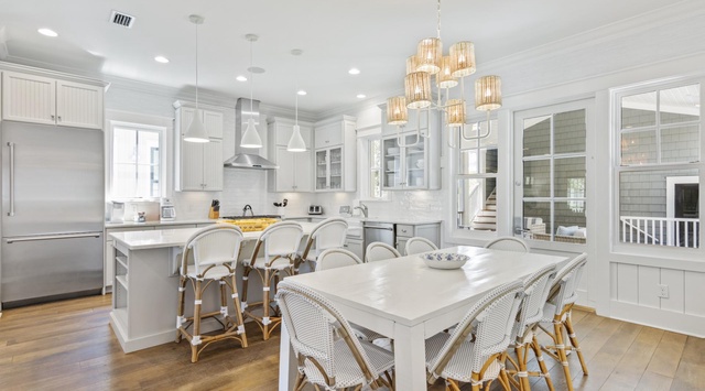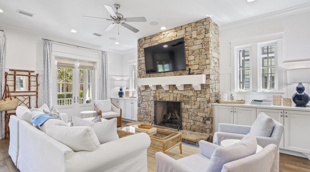 Experience ultimate relaxation on the beautiful front porch with cushioned furniture and views of the park. Step into the gorgeous first-floor great room, featuring high ceilings and abundant natural lighting. Relax in the living area, surrounded by high-end furnishings, a cozy fireplace, and a 65” TV—perfect for movie nights with the family. Prepare delicious meals in a pristine white kitchen, equipped with beautiful hardwood floors, Thermador appliances, and a sleek kitchen island with built-in appliances that can seat 3. The adjacent dining area can accommodate up to 8 guests on beachy rattan chairs. Retreat to the guest bedroom, furnished with a luxurious king bed and access to the front porch through French doors. Outside, a lovely fenced-in back porch provides plush seating and a TV, leading to a private patio with an alfresco dining table and a convenient propane grill.
