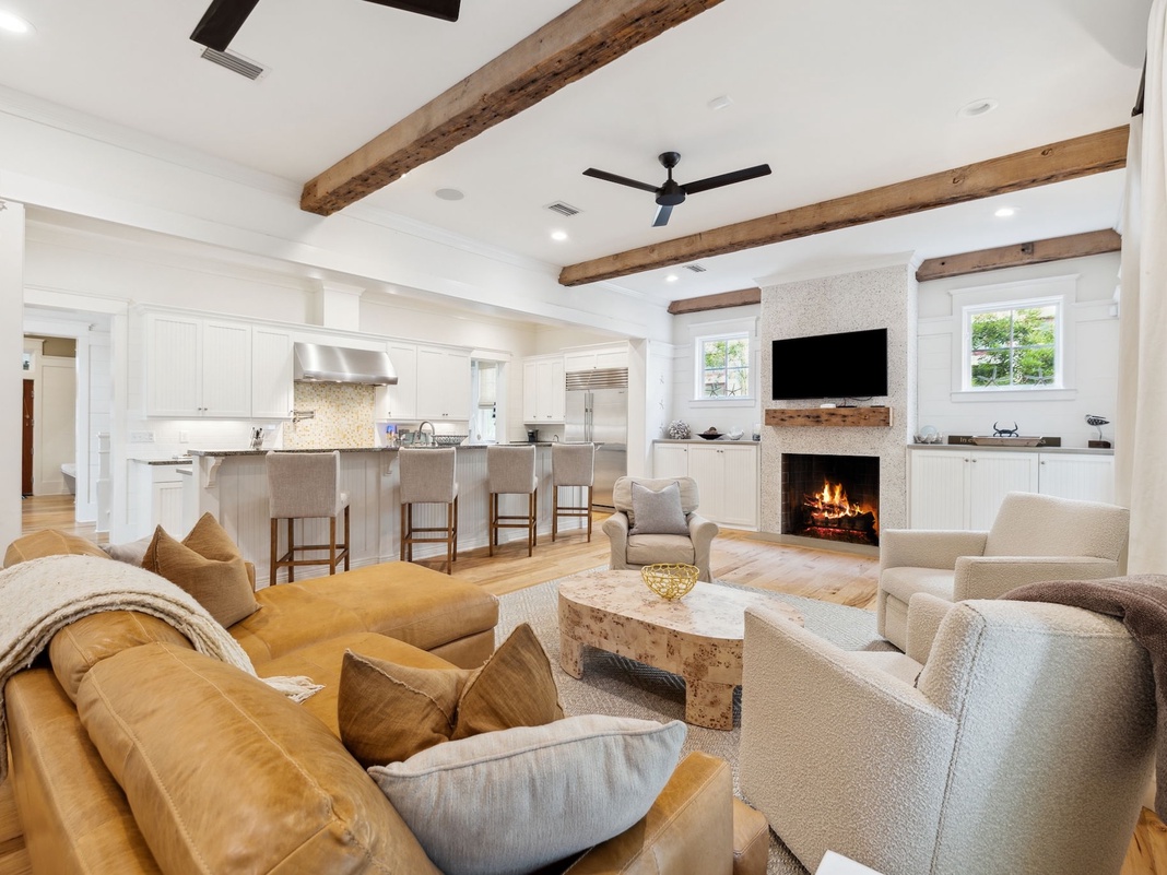 An open living, dining, and kitchen space has wood floors, a white interior, and pecky cypress ceiling beams. A chaise sectional and armchairs create a cozy spot for guests to visit or watch a favorite movie on the 55” Smart TV. Tucked behind the living area is a dining table that seats 8. A chef’s kitchen has premium Wolf, Sub-Zero, and Bosch appliances, granite countertops, and a raised bar that seats 5 comfortably. Families and guests with mobility issues will appreciate the ease of a first-floor primary bedroom located behind the kitchen. The primary bedroom has a coffered ceiling, king bed, and a private bathroom with a clawfoot soaking tub and separate shower. A comfortable screened side porch has a gas grill and a dining table with bench seats. A fully enclosed outdoor shower on the porch makes it easy to rinse the day’s sand away. Outside, a beautiful wood-burning tabby fireplace is surrounded by a sofa and cushioned chairs on a raised deck. After a long day playing at the beach, families can easily enjoy a dessert of gooey s'mores beneath the stars.