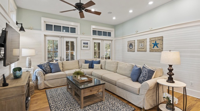All bedrooms in this home conveniently include a mounted TV. The first bedroom features a queen bed with a trundle and access to the front screened porch with hallway bathroom access. The second guest room is equipped with a king bed, a private ensuite bath, and access to the back porch. You will find the luxurious primary just across the hall, boasting a plush king bed, shared porch access, and an en suite primary bath with dual vanity sinks!