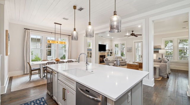 DETAILS: "Sunshine and Saltwater" is a luxury vacation rental ideally situated in WaterColor's Forest District. Featuring four bedrooms, three and a half bathrooms, two living areas and impeccably chic accommodations for up to ten guests, this beach abode offers the perfect spot to bring the whole family. On the first floor your will find the spacious living room, dining area overlooking the surrounding forestry and fully equipped kitchen which flow seamlessly from one another making entertaining on nights in a breeze! The primary bedroom rests on the first floor and is completed by a private bathroom with a superb soaking tub and walk in shower. As you make your way upstairs you are greeted with the bonus living area that leads out to a sprawling screened porch overlooking Pine Needle Way. The second floor also offers an additional king bedroom suite and two guest bedrooms which share a jack and jill bathroom. The home's convenient location offers swift access to Publix for your grocery needs and Pizza by the Sea. When you're ready to get out and about, explore WaterColor and Scenic 30A on the bikes provided or head over to neighboring Seagrove and Seaside for superb shopping and dining options. Check availability and book today!
