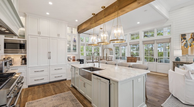 On the second floor are the kitchen and primary bedroom. The primary bedroom has a modern 4-poster King bed and access to a private screened porch. Its private bathroom has a separate shower and a soaking tub uniquely positioned across from a vanity. Guests will enjoy the space and thoughtful design of the kitchen, the open-concept living and dining room. Premium appliances, a farmhouse sink, pale blue and white cabinets, and a marble-topped island with seating for 4 forms a luxurious cooking space that guests will gravitate to. A round dining table has seating for 6. Doors open from the living and dining room onto a screened balcony with a wrap-around sofa and porch bed swing.