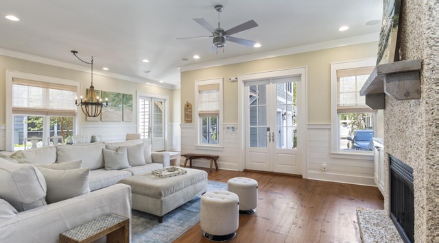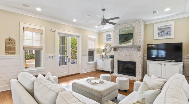 DETAILS: Southern coastal charm abounds in this home, located in the Passages District of WaterSound Beach. From the moment you walk inside, you will feel right at home with its rich hardwood flooring, beautiful architecture, and amazing details. The living area is adorned with a beautiful fireplace, comfortable seating, and a flat screen television. The open floor plan connects the kitchen and dining areas to the living space. With seating for everyone, the unique dining table provides the perfect backdrop for meals together. The kitchen has state-of-the-art appliances, beautiful white countertops, and creamy white cabinets which compliment a unique antique-style sink. For convenience, the primary suite is also located on the first floor. It boasts a large king bed, flat screen television, doors connecting with the outdoor patio, and a private primary bath complete with a double vanity, soaking tub, and separate tiled shower.