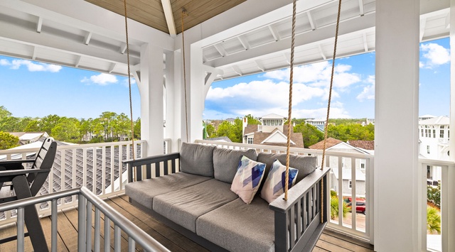 An additional hangout spot awaits on the third floor, with a kitchenette, couch, and 55” Smart TV. There are 2 guest bedrooms—the first with 1 queen bed and the second with 2. On the furnished lookout tower, head up the spiral staircase for a bird’s eye view of the neighborhood. Savor a cold drink at the bar-height table for 4 or curl up with a book on the oversized porch swing.