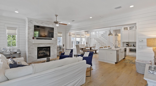 A deep front porch with rocking chairs and wooded views welcomes guests to the home. Stepping inside, guests will discover a professionally decorated open living, dining, and kitchen space with honey-colored wood floors and white shiplap walls. A wrap-around couch and chairs face a 65” TV and gas fireplace. 2 doors open from the living area to a screened side porch with an outdoor dining table. A light and airy kitchen has marble countertops, premium appliances, a 6-burner gas cooktop and range, and room for 3 at the dine-in island.
