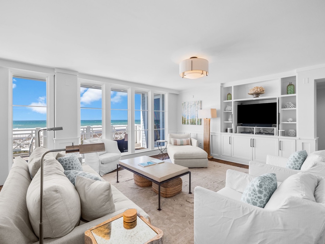 DETAILS: The impeccable location, unobstructed coastal views and modern design of this condominium make this unit the perfect getaway for your party. Located right on the beach in Watersound's Crossings District, this 3 bedroom, 3.5 bath, condo sits just steps from the beach. The 180 degree panoramic views, soaked in from the second dining table and additional seating area, on this deck-sized" balcony sets this unit over the top. Upon entering the home, you are greeted by the living and dining areas with ample space to sit and enjoy each other's company with the sea's breeze filtering in from the coastal doors. There are club chairs, a couch, a chaise lounge, and an additional cushioned chair in the living area. The beautiful dining room table seats 8 comfortably on its large bench and 5 chairs. The kitchen has stainless steel appliances and black granite countertops. There is also a half bath located near the front door. The Master Suite can be found on the East wing of the condominium. In the bedroom, there is a king bed, club chairs, a TV, and an access way to the magnificent deck. Across the hall, and after passing Moby, the home's fish mascot, is the sophisticated master bath. It has a double vanity, walk-in shower, jetted tub, two very large mirrors, and two large walk-in closets. The other bedrooms can be found on the West Wing of the condominium. The first of which has a king bed, an additional access point to the spacious balcony, and a connecting bath with a single vanity and shower-tub combo. Across the hall, the third and final bedroom has two double beds and a connecting bath with a single vanity and shower-tub combo. There is also a bonus office space in the hallway between these two bedrooms.