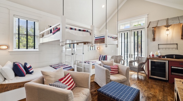 A 4-person table, 2 armchairs, and a desk await on the second-level landing, where guests can read, sip coffee, or check emails. In the luxurious primary bedroom, find a king bed and a private balcony furnished with soft patio seating, a comfy porch swing, and an overhead fan for comfort. Adjacent is a roomy office for mixing work and play. There are 2 guest bedrooms with a queen bed and a king bed, respectively. The spacious bunk room is a perfect hangout spot for kids and teens with 2 twin-over-twin beds, a beverage fridge, a sitting area with a TV, and balcony access.
