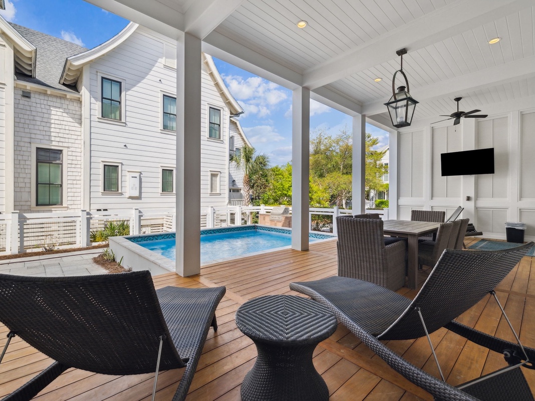 A detached carriage house is located on the other side of the pool deck, and it has a kitchenette, balcony, living area, private bathroom, and bedroom with a king bed. There is incredible outdoor space surrounding the pool, which is completely fenced in. Guests can enjoy al fresco style meals at the dining table or lounge in one of the many chaises in either the sun or shade. The outdoor kitchen makes it easy to entertain multiple guests without feeling overwhelmed by space. Take a quick walk to the beach when you're not enjoying the private pool or one of the golf carts to cruise along 30A. You'll find there are plenty of restaurants, shopping, and kid-friendly activities in the neighborhood of WaterSound and nearby communities. Don't miss your chance to stay at "Life By The Sea"!