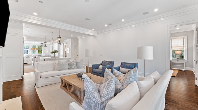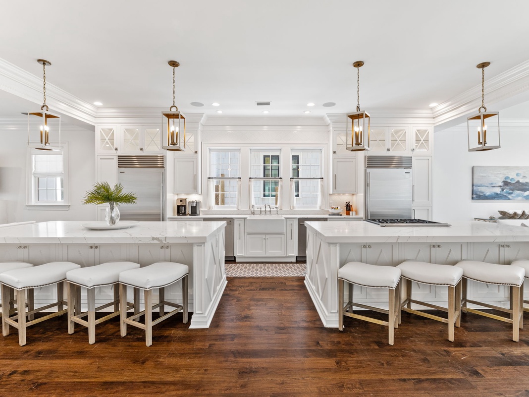 Traditional box trim and classic molding create a serene and refined aesthetic inside this 3-story home. High-end appliances—including a Wolf stovetop—in the expansive, open kitchen will delight guests with a flair for cooking. Centrally located with double islands that seat 4 each, it’s easy to entertain while preparing meals. Dual seating areas with plush furnishings frame each end of the great room—1 surrounds a large TV, while the other resides beside the 8-person dining table. Off the hall is a wine cooler and dry bar. Outside, take advantage of the seaside climate with the gas grill and private pool. Also on this floor is 1 guest bedroom with a king bed and a private bathroom.