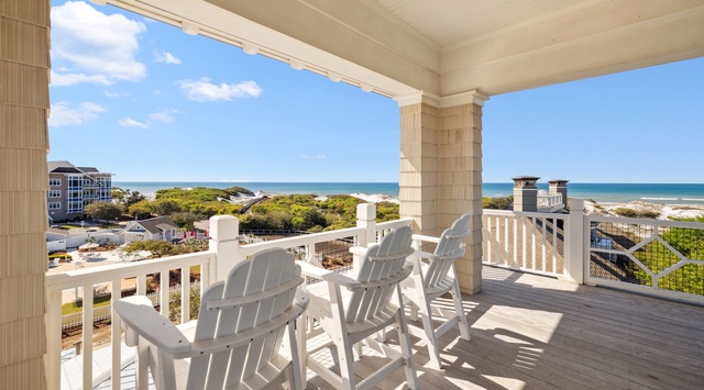 The second floor is the main level of the home and opens the main living room and kitchen up to a wrap-around balcony. The gourmet kitchen features premium, stainless-steel appliances, casual seating at the bar for 6, and a dining table that can seat 8 guests. The spacious living area opens up to the balcony with sliding French doors to let in the fresh, salty air during warmer months. The balcony has ample outdoor seating and porch swing. More guest rooms are down the hall, one with a king bed and private bathroom and the other with a queen and private bathroom.