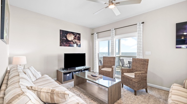 The second-floor great room is open and airy, with beautiful decor. Spend time with loved ones in the expansive living area, complete with a TV and Blu-ray/DVD player—perfect for movie nights! Walkouts from the great room lead to the screened-in porch, where guests can enjoy cooling coastal breezes and stunning views. The upscale kitchen is a chef’s dream, with beautiful granite countertops and stainless steel appliances. The 4-stool breakfast island is great for casual dining, while the extra-large wood dining table is ideal for a sit-down dinner for 12. There’s a laundry room off the kitchen with a second full-sized refrigerator for convenience.