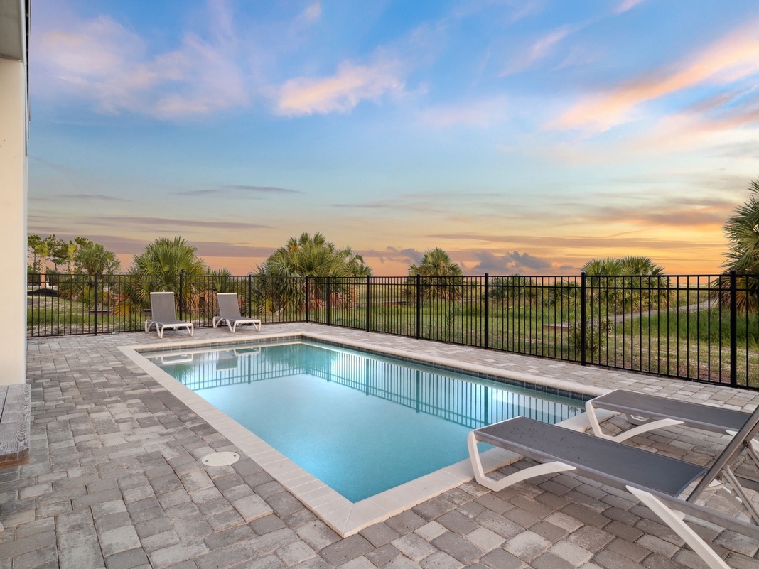 Designed for relaxation and recreation, the ground level of this 3-story home boasts a living space with a couch, loveseat, beverage fridge, arcade game, TV, 3-person table, and sliding glass door to the patio. Indulge in chill afternoons with the group, or make it a kid’s hangout spot. The fun continues outside, where a grill, picnic table, and patio sectional sit in the shade. Venture past the gate to find another picnic table, chaise loungers, and Adirondack chairs surrounding a glistening private pool. At the end of the backyard is a path to the beach for fun along the shore.