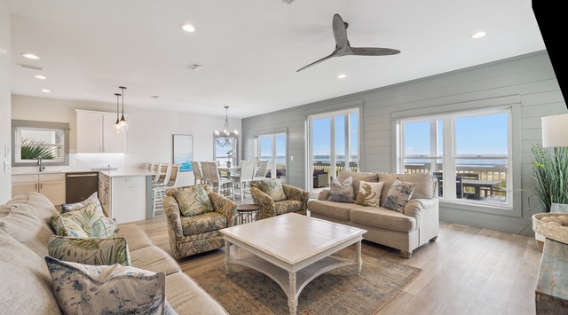 The second-level living, dining, and kitchen spaces are seamlessly connected, offering clear views of the glittering Gulf from every corner of the room. Grab a bowl of buttery popcorn and gather in the living room for a movie night—there’s plenty of seating with a couch, loveseat, and 2 armchairs. Enjoy slow-paced mornings making pancakes in the chef’s kitchen, equipped with high-end appliances and a 4-stool breakfast bar. A table for 8 is by the windows, and out on the shady balcony is an arrangement of patio furniture plus a 4-person table. When evening falls, guests can choose between retiring to the guest bedroom with a queen bed and private bathroom or the bunk room with a full-over-full bed.