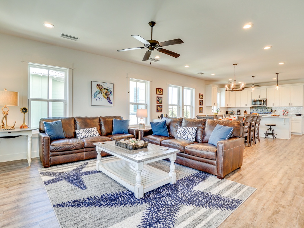 The main living area is on the upper level and features an airy, open-concept layout. Culinary enthusiasts will love the gourmet kitchen’s high-end GE appliances, marble countertops, and 2-stool breakfast bar—perfect for entertaining friends or miniature taste-testers! Past the 9-seat formal dining table is a sunny living area with 2 leather sofas. Continue outside to the Gulf-facing deck furnished with a 6-seat patio table for alfresco dining and glimpses of the shimmering Gulf waters. When evening falls, retire to the spacious primary bedroom with a king bed, 60” TV, and a private bathroom with a soaker tub.