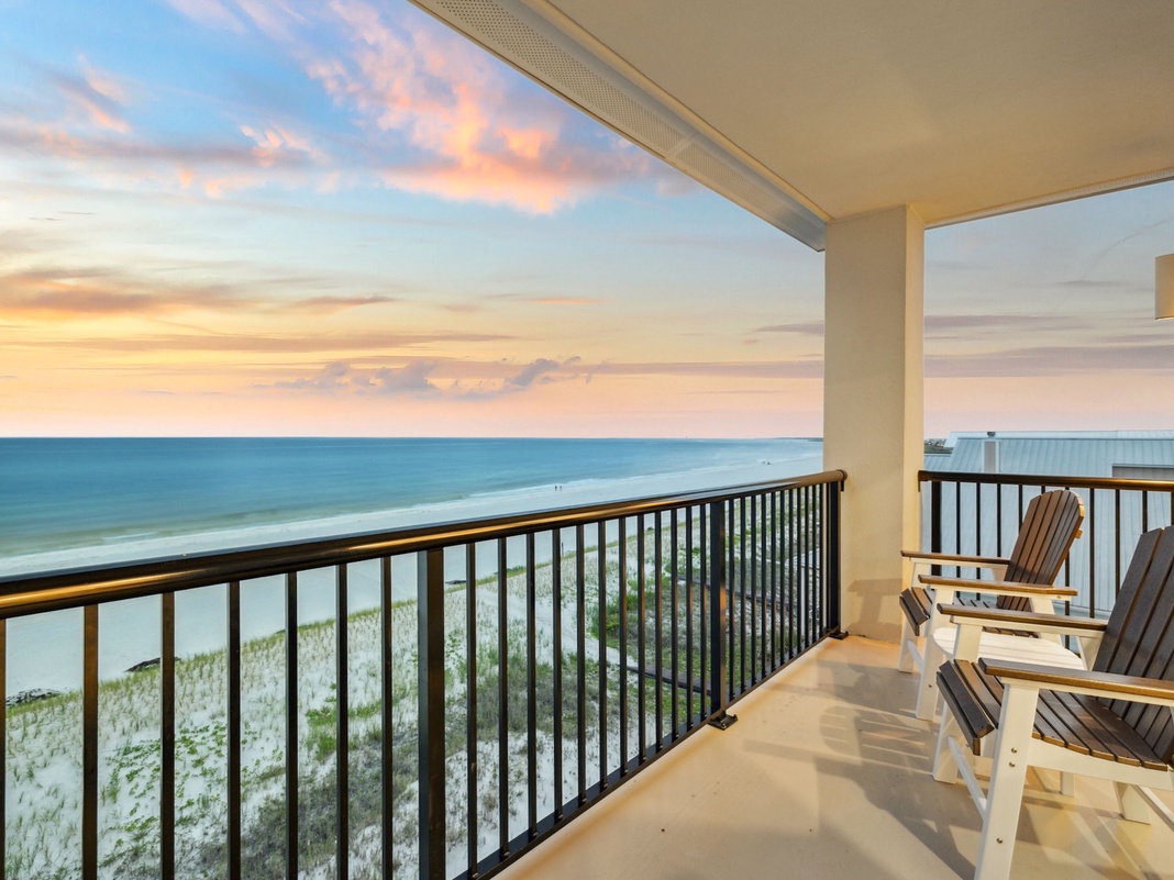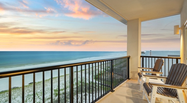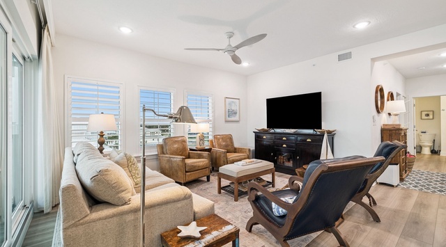 Bright and filled with natural light, this single-story corner unit impeccably combines modern comfort with coastal charm. The kitchen has everything needed to inspire inner chefs, including high-end Café appliances, spacious countertops, and a 5-stool breakfast bar—plan the day over coffee and crepes! For formal meals, the wooden dining table, accented with wicker-style seating, accommodates 6-8 guests. End the night relaxing around the Smart TV in the living space, beautifully adorned with a sofa, 2 sets of leather armchairs, and sea-inspired décor. Through the sliding glass doors, a large, covered balcony overlooks the Gulf. Grab a drink, sit back, and appreciate the beautiful pastel sunset. When it’s time to turn in for the night, choose between 3 lovely bedrooms. The primary bedroom features a king bed, TV, Peloton bike, and a private bathroom, while the 2 guest bedrooms each have a soft queen bed. A washer and dryer in the hall closet offer convenience for extended stays.