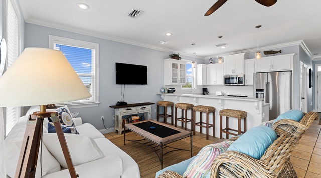 An exterior staircase leads guests to the front door on the second story, next to a convenient laundry room—feel free to pack light! Continue past the nautical-inspired guest bedroom with 2 twin beds and a TV into the sunny great room. The modern kitchen is fully equipped with high-end appliances and a breakfast bar for 4 that overlooks the living space. Sink into the soft couch and matching wicker armchairs after a day of exploring to watch TV. The spacious dining table with a bench and 4 chairs offers plenty of room to gather for dinner or a family-friendly board game. End the evening with a chilled nightcap on the large covered porch with 2 tables for 4.
