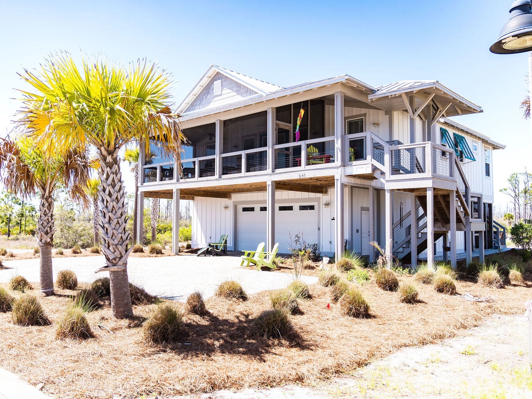 DETAILS: Cape Escape is an elevated 4- bedroom, 4-bathroom Cape San Blas home with screened-in porch, and access to a quiet community pool and basketball court that sleeps 10. Located near beach access, a private swim spa, and only 3 blocks from a gorgeous state park, this stunning home has everything guests need for an unforgettable beach getaway.