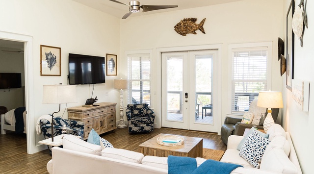 Once up the stairs, stepping in from a screened-in porch, guests are greeted by the open-concept kitchen and living room that is perfect for entertaining. Guests may select from 2 guest bedrooms, a primary bedroom, or a bunk room with a twin-over-twin and a twin-over-full bunk bed.
