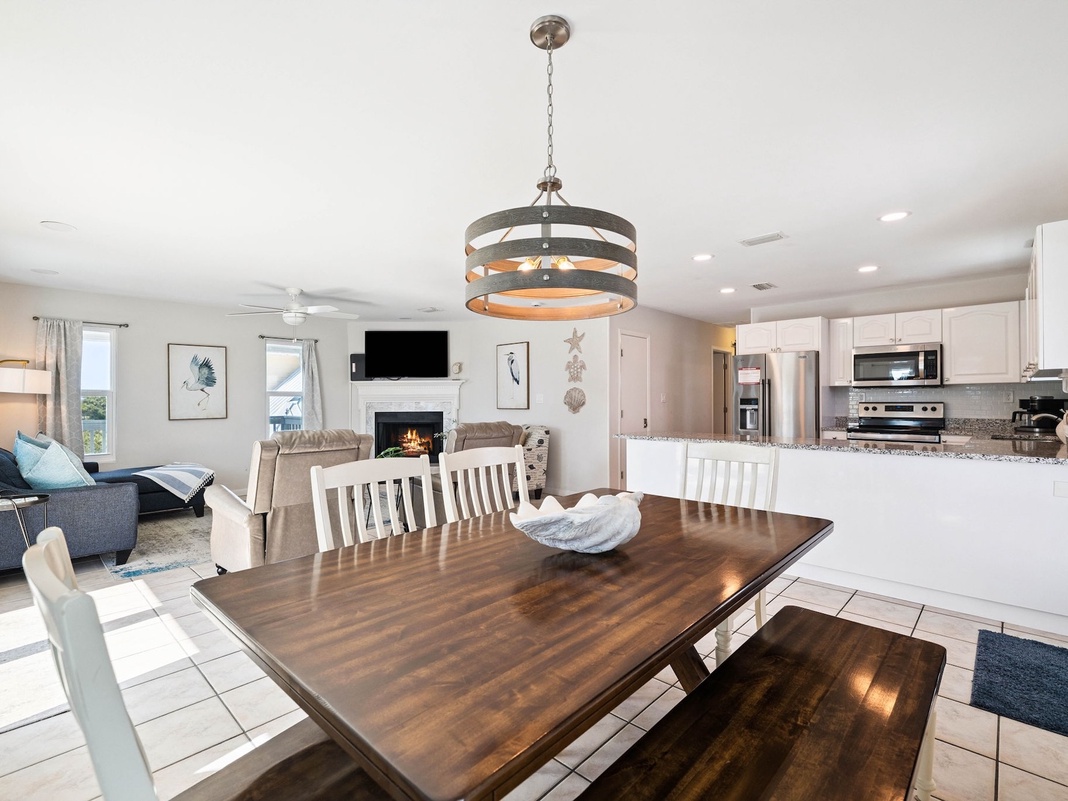 Take the exterior stairs to the second level, where a large wraparound porch with a gas grill, picnic table, and Adirondack chairs invites unwinding in the beautiful coastal atmosphere. Inside, sunlight illuminates a comfortable living space with a soft chaise sofa, 2 plush recliners, 1 armchair, and a Smart TV. The spacious kitchen features high-end appliances and an open layout, encouraging conversation and mingling. Guests can dine at the farmhouse table for 6. At bedtime, retire to the primary bedroom boasting a king bed and private bathroom. There are 2 guest bedrooms—1 queen bed in the first bedroom, and 1 full bed and 1 twin bed in the second—plus a queen sleeper sofa in the living area.