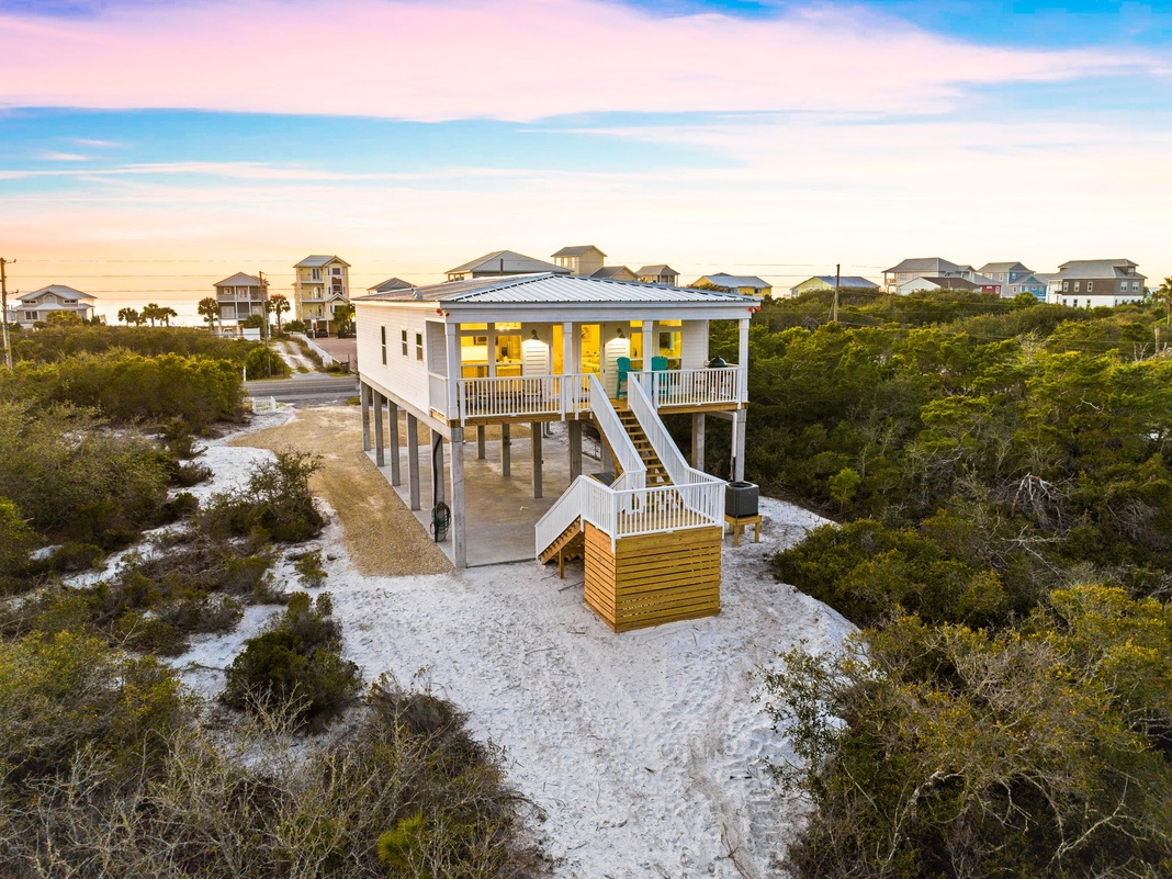 DETAILS: Sleeping 10, Flying Scallop is an outdoor lover’s dream, boasting 3 bedrooms and 3 bathrooms in North Cape San Blas. Discover the ultimate setting for a laid-back and gorgeous Gulf vacation steeped in natural beauty. Nearby, Salinas Park and St. Joseph Peninsula State Park are birdwatching paradises for migratory fowl passing through on the Atlantic Flyway, and the area has some of the best topwater fishing and kayaking. Guests will delight in this home’s private pier on St. Joseph Bay and the short walk to the general store for cold drinks and snacks—only 150 feet away.