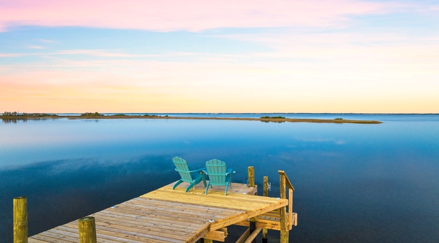 The outdoor staircase leads to the front porch, outfitted with a Big Green Egg grill and seating that overlooks the Bay. Enter the home directly into the large living, dining, and kitchen areas with plenty of room for the entire group to gather. After a day of fishing and exploring, curl up on the overstuffed sectional and stream a favorite movie on the 65” Smart TV. GE appliances and an island that seats 4 are featured in the open and bright kitchen. In the corner, a dining table big enough for puzzles and board games has seating for 6. Guests who prefer to pack light will appreciate the laundry room. When it’s time to retire for the night, there are 2 guest bedrooms with a king bed and a bunk room with 2 XL twin-over-twin bunk beds—all with Smart TVs. For additional accommodations, the living room has a queen sleeper sofa.