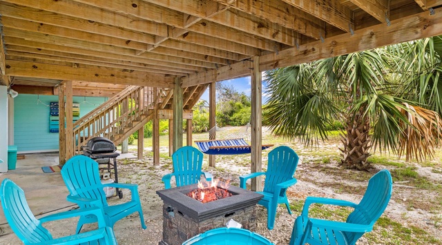 The ground level of this charming 3-level beach abode is perfect for relaxing in the coastal air with a hammock, cornhole game, and propane grill. Sit and savor an alfresco meal at the 6-person picnic table or relax on the 6 Adirondack chairs. An outdoor shower completes the idyllic setting.