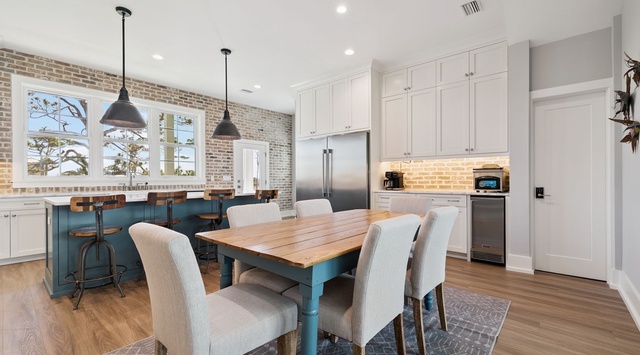 Upstairs, the main floor acts as the heart of this home, where soft blues and sandy beiges come alive under streams of natural light, framed by breathtaking coastal views. Sink into the L-shaped sectional in the cozy living room to plan the day's itinerary or enjoy a family movie night on the large TV. The kitchen and dining area blend exposed brick, high-end appliances, and ample seating at the 4-stool breakfast bar or 6-chair traditional dining table for the ultimate gathering spot. A small coffee bar adds convenience. Beyond 2 tucked-away hallway washers and dryers, guests can easily retire to the 3 spacious bedrooms. A lovely primary with a king bed, private bathroom, and deck access, alongside 2 versatile guest bedrooms, each with a private bathroom and a king bed that converts into 2 extra-large twin beds is perfect for families! Step outside to the expansive second-floor deck, where a covered sitting area with plush furniture and a TV invites relaxation. Fire up the Big Green Egg for a flavorful feast, dine around the 6-person table, or take a refreshing swim in the private spa before sunbathing at the beach.