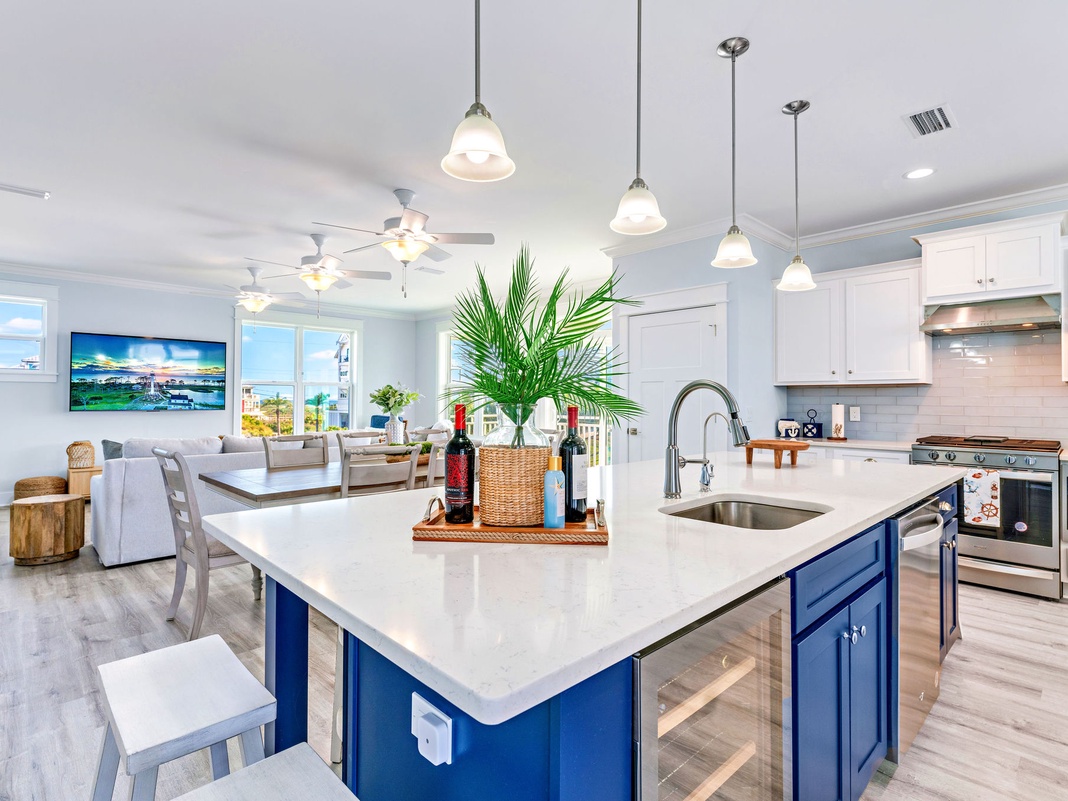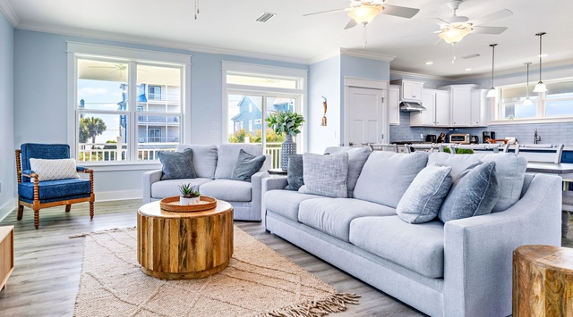 Whimsical coastal accents wind throughout this reverse-floor plan home, paired with a calming color palette of ocean blues and grays. The first floor features a mix of comfortable guest bedrooms—all with private bathrooms, Smart TVs, and outdoor access. The primary bedroom features a king bed, 2 guest bedrooms each have a queen bed, and the bunk room boasts 1 twin-over-twin bunk and 1 full bed. Outside lies an enclosed pool deck with a firepit and plenty of shaded seating. Lounge with the latest resort-style striped umbrella as the sun sparkles across the private pool. The cornhole set beckons for a tournament while the chef of the group fires up the propane grill for a barbecue. An outdoor shower makes rinsing off after an impromptu trip to the beach a breeze. As the day winds down, share stories and s’mores around the firepit.