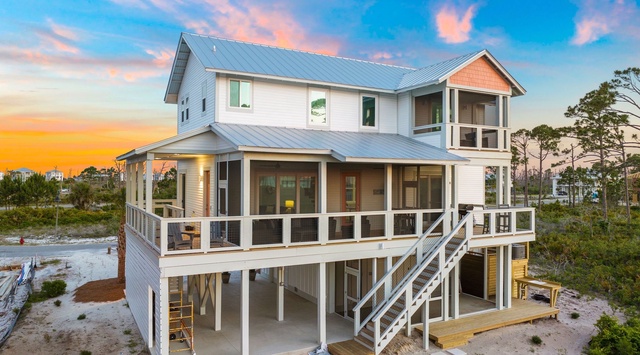 The second floor of this home was made for rest and relaxation with 4 comfortable bedrooms. There is 1 guest bedroom with a king bed and a private screened-in balcony with furniture, 2 guest bedrooms with king beds, and 1 bunk room with 2 twin-over-twin beds. Enjoy gorgeous Forgotten Coast views from the top floor!