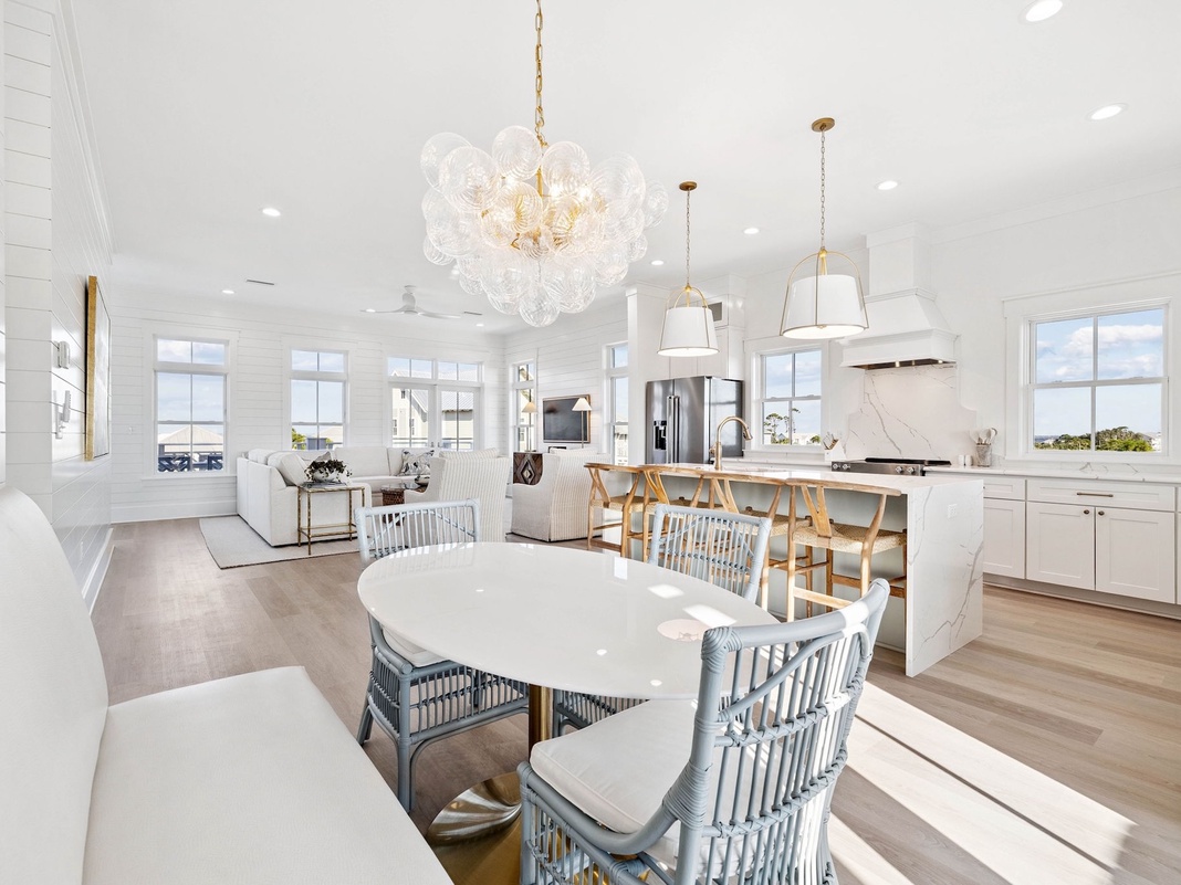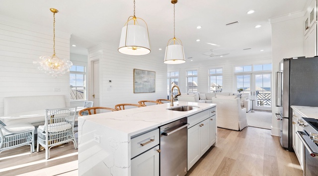 On the third floor awaits the impeccably designed great room, adorned with crisp white shiplap walls and golden accents. The kitchen’s gleaming countertops and KitchenAid appliances invite joyful culinary exploits, while the 4-person breakfast bar makes it easy to entertain. To the side is a dining table with 3 chairs and a banquette bench for 2 beneath an effervescent chandelier. When it’s time to relax, sink into the living space’s 2 striped armchairs and plush sectional to catch up with loved ones or stream favorites on the 55” Smart TV. The balcony offers sweeping views of the neighborhood, peek-a-boo glimpses of the water, alfresco dining at the table for 10, and a cozy spot for intimate conversation and sunset cocktails.