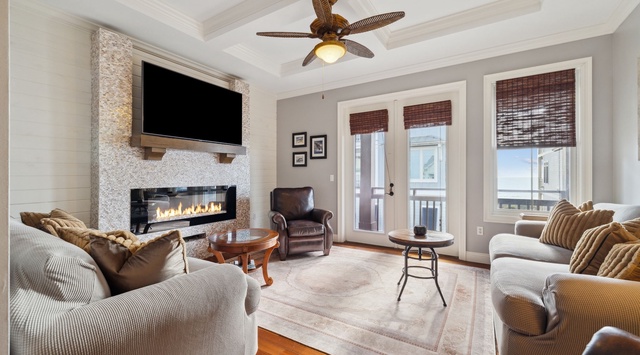 Enter through a covered front porch, where twin Adirondack chairs offer a quiet spot to take in the laid-back atmosphere. The ground floor features a spacious living area with an LED fireplace, 55” TV, and beverage fridge. Prepare for a lively afternoon of friendly competition on the foosball table in the garage. A colorful guest bedroom with a queen bed and private entry can be found on this floor. Outside, a patio with a hot tub, 4-person table, and built-in BBQ grill makes dining alfresco a must. Around the side is an outdoor shower for rinsing off after a quick jaunt to the beach.