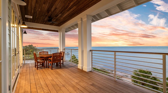 Relaxation begins on the ground floor’s shady lanai with 2 alfresco tables collectively seating 8 and views of St. Joe’s Bay.