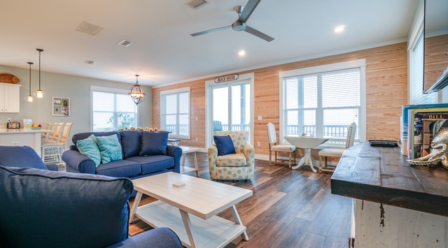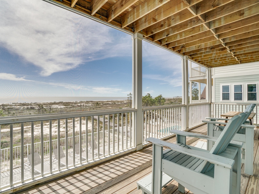 Steps lead up to a large, screened-in Gulf-front porch and open to an open living, dining, and kitchen area on the first floor. Wood laminate floors and modern beach decor create a relaxing environment for friends and family. A sofa, loveseat and chairs surround a 58” TV, and a sleek kitchen with white countertops seats 4 at a dine-in island. A dining table with bench seating has space for 8, and the entire living space enjoys views of the beach from sliding glass doors and windows. A guest bedroom with a queen bed is located behind the living area.