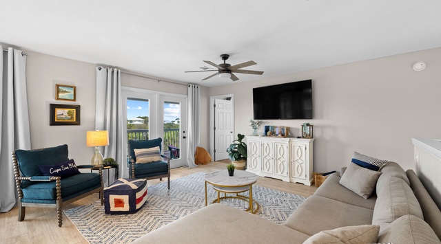 Ooh Rah Beach features two comfortable living areas located on the second and third floors. The living room on the third floor is located just off the kitchen and dining room. It comes complete with a plush sectional sofa, a wall-mounted flatscreen Smart TV, and access to a deck with outdoor furniture—ideal for relaxing while listening to the soothing sounds of the Gulf.