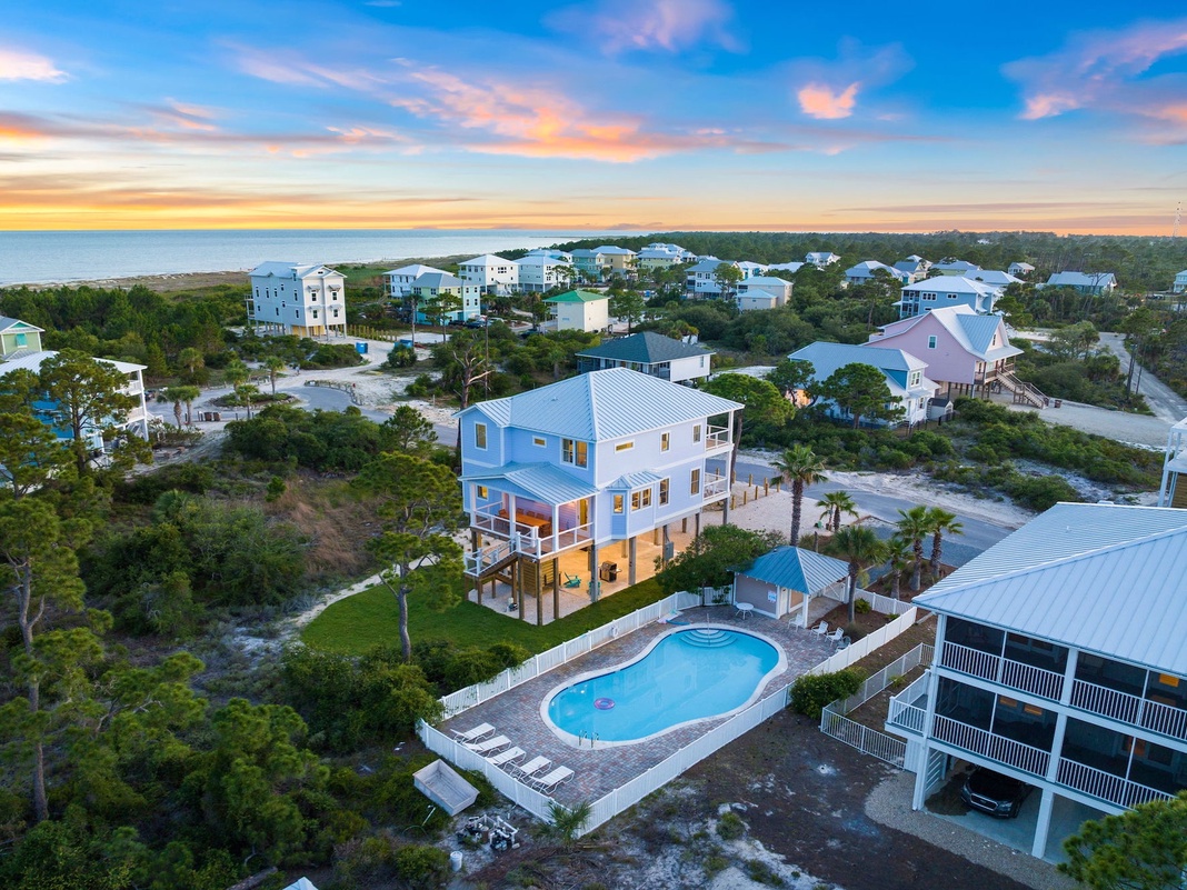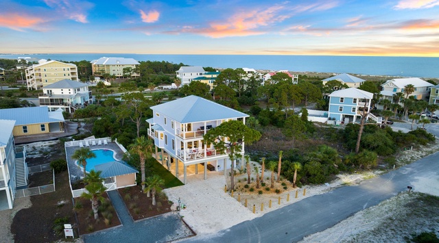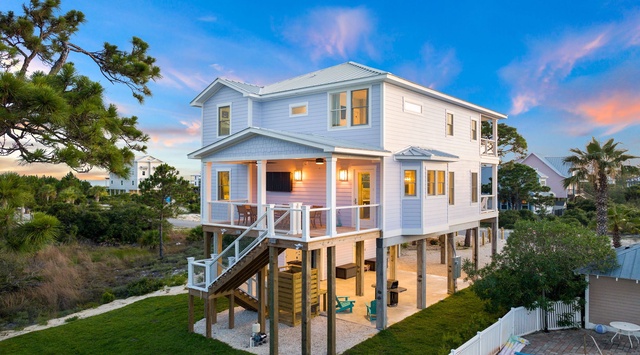 DETAILS: Amazing amenities meet spectacular location! Purple Piper is a stunning 4-bedroom, 4-bathroom home with Gulf views on beautiful Cape San Blas that sleeps 11. Perfect for family gatherings, this beautiful coastal property boasts indoor and outdoor dining areas, an upper deck with beautiful Gulf views, and access to the community pool next door. Beach access is less than a 5-minute walk away via a community boardwalk at the end of the street!