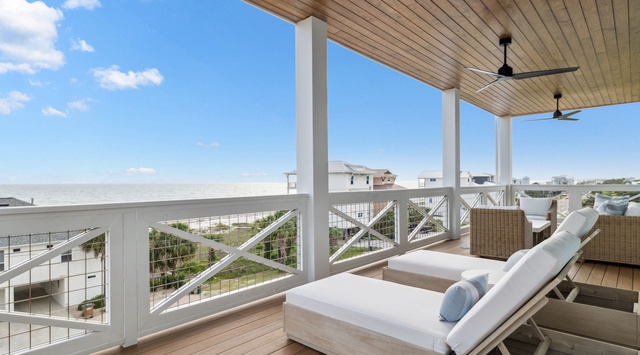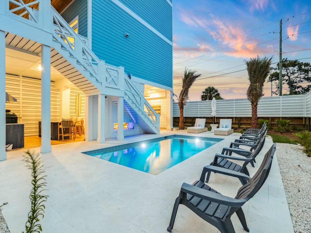 DETAILS: When the beach and sea call, escape to Beacon Bella. This luxury 6-bedroom, 6.5-bathroom St. Joe Beach home sleeps up to 25 guests. There are plenty of coastal activities, local restaurants, and entertainment, thanks to nearby Mexico Beach and Port St. Joe. Picture sun-drenched days of barbecues, swims in the private pool, colorful sunsets over the Gulf, and strolls to the beach—right across the street!