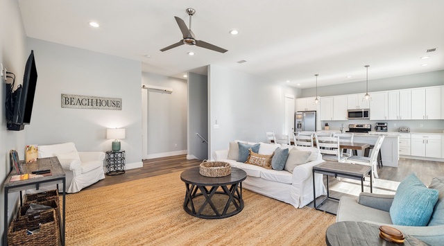 Take the interior or exterior stairs to the second main level. A woven sisal rug, slip-covered furniture, and accents of soft blue create a calm, beachy atmosphere for unwinding or watching TV. The kitchen is well-equipped with high-end appliances and a vast center island that doubles as a breakfast bar for 4. When it’s time to dine, there’s space for 8 at the farmhouse dining table, or enjoy an alfresco experience on the balcony with peek-a-boo water views. Adirondack chairs offer comfortable seating for after-dinner coffee and cocktails in the refreshing Gulf air. For restful nights, retreat to the primary bedroom boasting a king bed and private bathroom or the 2 lovely guest bedrooms, each with a queen bed. A washer and dryer add convenience for extended stays.