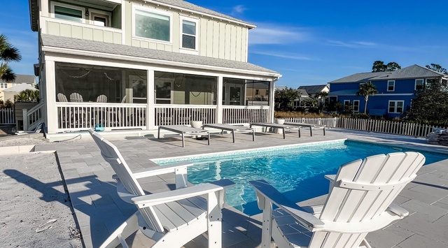 A charming screened-in front porch with 2 rocking chairs greets guests upon arrival at this pet-friendly home. On the first level, luxe beach-inspired décor creates a soft and serene atmosphere. The living space features a slip-covered sectional for relaxing with the group, while a 65” Smart TV makes entertainment effortless. Cooking is a delight in the vast kitchen, boasting high-end appliances, an open layout, and an enormous 6-stool breakfast bar—perfect for brunch or post-swim snacks! Enjoy meals of fresh seafood in the picturesque dining nook with an 8-person table. The back screened-in porch, furnished with a 4-person high-top table, 4 Adirondack chairs, and a cushioned porch swing, is the ultimate spot for sunset cocktails or a tranquil afternoon. Outside, find an idyllic setting for savoring the sunshine with a 4-person patio table, grill, sun loungers, a sparkling private pool, outdoor shower, and a sand volleyball court!