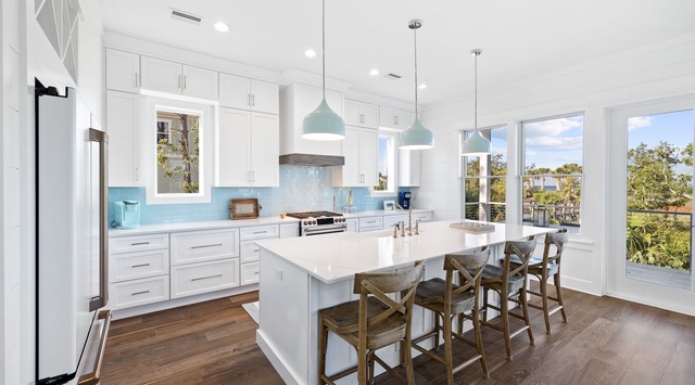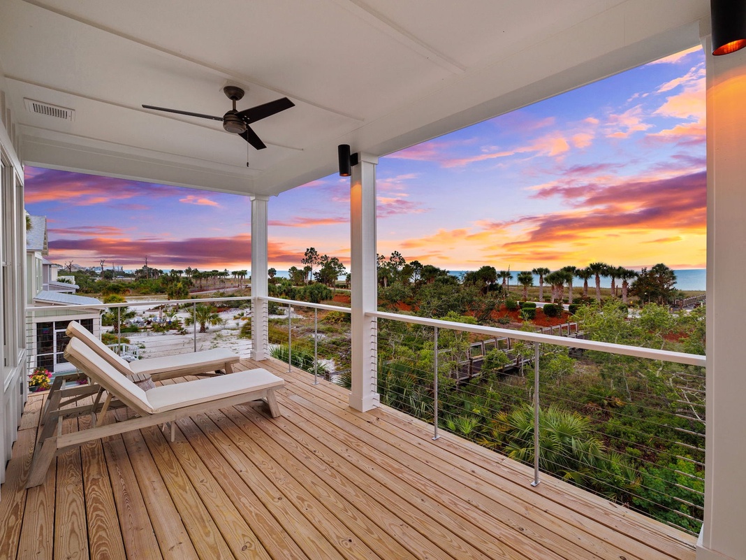 Guests will find everything they need to relax and rejuvenate on the top floor, with 3 guest bedrooms—1 bunk room with 2 twin-over-full beds, 1 guest room with a queen bed, and 1 king bedroom with balcony access and Forgotten Coast views.